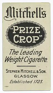 The Imperial Tobacco Company (Great Britain and Ireland) Ltd. was created in December 1901 through the amalgamation of 13 British tobacco and cigarette manufacturing companies which were being threatened by competition from the American Tobacco Company: initially W. D. & H. O. Wills of Bristol merged with Stephen Mitchell & Son and, subsequently, other smaller companies joined in the amalgamation.[26] However, Stephen Mitchell & Son continued to trade under its own name and retained responsibility for its own manufacturing and selling until well into the 20th century.[4]