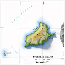 Stephens Island is at the northernmost tip of the Marlborough Sounds in the South Island of New Zealand. It lies two kilometres to the northeast of Cape Stephens, the northernmost point of D'Urville Island. The island is 1.5 square kilometres (0.58 square miles) in size, and rises 283 metres (928 ft) high from the sea.[1]