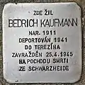 Bedřich Kaufmann was born on 25 November 1911 in Prague. His first name is also written Bedrikh or in the German version Friedrich. He was the son of Hugo Kaufmann and Olga née Ehrmann. He had two younger brothers: Robert (born 1913) and Hanuš (born 1917). He was a merchant. On 4 December 1941 he was deported from Prague to Theresienstadt concentration camp by transport J. His number on this transport was 194 of 1,000. On 18 December 1943 he was deported to Auschwitz concentration camp by transport Ds. His number on this transport was 474 of 2,503. His inmate number in Auschwitz, tattooed on the left arm, was 85587. When the Red Army approached Auschwitz in early 1945, most inmates of the KZ were sent on death marches toward west. The group in which Kaufmann had to march was later called the Hungermarsch by one of the inmates, Friedrich Kraj. It was geared toward Theresienstadt. When exhausted inmates — without enough food, without proper cloths, without proper shoes — broke down they were shot by the SS. On 23 April 1945, when the group reached the Khaatal near Schwarzheide, Bedřich Kaufmann was murdered by the Nazi regime.[1][2][3][4][5]