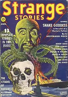 Fantasy and occult fiction had often appeared in popular magazines before the twentieth century, but the first American magazine to specialize in the genre, Weird Tales, appeared in 1923 and by the 1930s was the genre's industry leader.[1] In 1939, two magazines were launched in the same niche: one was Unknown, from Street & Smith; the other was Strange Stories, published by Standard Magazines and edited by Mort Weisinger, who was already editing Thrilling Wonder Stories and Startling Stories for Standard.[2] The budget for fiction was half a cent per word, which was a low rate compared to other magazines.[3] Weisinger obtained stories from many authors who contributed to Weird Tales, including August Derleth, Henry Kuttner, and Robert Bloch, who between them accounted for 40 of the 148 stories the magazine printed over its thirteen issues.[4] Critics consider little of the fiction memorable. Among the better-received stories were two by Kuttner: "Cursed be the City" and "The Citadel of Darkness" in the April and August 1939 issues respectively;[2] "Logoda's Heads", by Derleth, which science fiction historian Robert Weinberg described as "perhaps Derleth's best weird fantasy for any magazine";[5] and some stories by Manly Wade Wellman in the early issues.[5] Other contributors included Eric Frank Russell, C. L. Moore, and Seabury Quinn.[2][5] There were no serialized novels; at the time, Standard's policy forbade them. Weinberg described the covers by Standard's in-house artists, Rudolph Belarski and Earle K. Bergey, as "among the worst ever seen on any pulp".[5] The magazine was an attempt to imitate Weird Tales, but Weisinger was never able to give it any distinctive character of its own.[2] It received little assistance from its sister magazines in Standard's publishing stable; typically each magazine carried advertisements for other Standard publications, but Startling Stories and Thrilling Wonder Stories rarely mentioned Strange Stories in this way.[6]