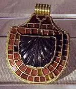 The jewellery consists of three gold pendants, two glass beads, one gold wire bead, and a fragment of a jet hair pin. The pendants and beads all seem to have been strung together, probably forming a necklace that was in place around the neck of the body. Two of the pieces consist of gold cabochon pendants inset with jewels, while the third is a very elaborate shield-shaped jewel inlaid with 57 red garnets and a larger scallop-shaped gem in the centre. The garnets rest on a thin layer of gold leaf to reflect the light and increase their luminosity.[21][23] It may have been created from recycled older pieces of jewellery, as the size, shape and thickness of the individuals garnet are all different.[9]