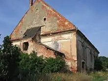 The rectangular building is made of massive walls with simple Baroque windows and has a saddleback roof. An external staircase, attached diagonally to the western facade, gives access to the women's gallery. Several oval ventilation openings in the gable are typical for the local architecture of the region.