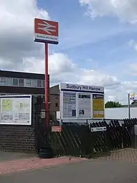 Signage on eastbound platform, indicating proximity to Sudbury Hill Underground station