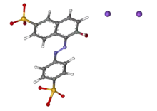 Sunset yellow FCF (also known as orange yellow S, or C.I. 15985) is a petroleum-derived orange azo dye with a pH dependent maximum absorption at about 480 nm at pH 1 and 443 nm at pH 13 with a shoulder at 500 nm.[1][2]: 463 When added to foods sold in the United States it is known as FD&C Yellow 6; when sold in Europe, it is denoted by E Number E110.[3]
