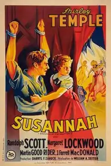 Susannah of the Mounties is a 1939 American Western film directed by William A. Seiter and starring Shirley Temple, Randolph Scott, and Margaret Lockwood.[1] Based on the 1936 novel Susannah of the Mounties by Muriel Denison, the film is about an orphaned survivor of an Indian attack in the Canadian West who is taken in by a Mountie and his girlfriend. Following additional Indian attacks, the Mountie is saved from the stake by the young girl's intervention with the Indian chief.