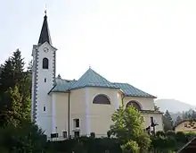 The local church stands next to Žerjav Castle and is dedicated to Saint Helena.[7] The church was first mentioned in written sources in 1495, and the first church at the site was built by the owners of Žerjav Castle. Tradition states that it was dedicated to Saint Helena by the lady of the castle, who was named Helena.[6] The original church was razed in the late 18th century, and the new structure was built between 1794 and 1797. The main altar features a painting of Saint Helena by Ivan Grohar. The side altars have paintings by Marko Layer (1727–1808) and Henrika Langus (1836–1876), and there is a painting of the Holy Sepulcher by Matija Koželj. An old painting of the Virgin Mary by an unknown artist hangs in the sacristy. Kamnica was elevated to a parish in 1875.[2]