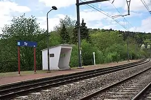 Sy railway station is a Belgian railway stop on Line 43 (from Liège (Angleur) to Marloie), located in the village of Sy on the territory of the municipality of Ferrières, in the Walloon Region of the province of Liège. It is a railway stop of the National Railway Company of Belgium (SNCB) served by Omnibus (L) and Rush hour (P) trains.