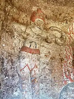 The Takase images are located on a tuff cliff on the east side of a small hill that extends to the Nanase River, a tributary of the Ōita River, at the northern foot of Mount Ryōzan, a sacred mountain that rises to the southwest of the Ōita Plain at an elevation of 596 meters. Dating from the late Heian period (mid-12th century), the niche with carvings is approximately 1.8 meters high, 4.4 meters wide, and 1.5 meter deep. It contains five statues centered on the seated statue of Dainichi Nyōrai, which is missing the tips of both hands and elbows, seated on a rectangular pedestal. It is nearly carved in the round and retains some traces of coloring. Facing Dainichi Nyōrai, on the right are Nyōirin Kannon and Batō Kannon, and on the left are Daiitoku Myōō and Jinja Taishō. [2] Outside the cave, in a small niche on the cliff to the right, there remains an embossed image of the Amida Triad on a lotus seat.