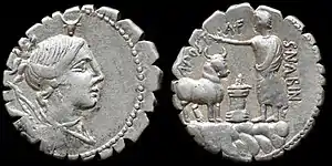 Silver serrate denarius struck by A. Postumius A.f. S.n. Albinus in Rome 81 BC.
