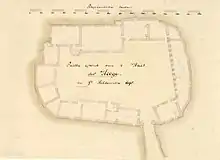 The castle terrain had buildings on all sides, except the eastern side, where a gallery was later constructed. On the northwest side was a high tower house with a still somewhat higher stair tower. This stair tower still survives, and part of the central building is the same as the tower house.[1] A thorough investigation of the construction history has not been done. The central tower house dates from, or was renovated during the 1620s works by Philips van Borssele van der Hooghe.[2]