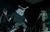 The Terrible Trio were originally three famous inventors in Gotham City, who sought new challenges by starting a criminal career. As a gimmick, they dress up in business suits while wearing cartoon masks of animals. From this, they become known as the Fox, the Shark and the Vulture.[4] Tapping into their respective areas of expertise, they base their technology on their respective animal themes. The Trio were recurrent foes of Batman and Robin for years, but they have also battled G'nort,[5] and, more recently, the new Doctor Mid-Nite.