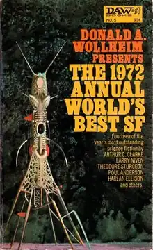 The 1972 Annual World's Best SF is an anthology of science fiction short stories edited by Donald A. Wollheim and Arthur W. Saha, the initial volume in a series of nineteen. It was one of two follow-up volumes to the previous year's World's Best Science Fiction: 1971 edited by Wollheim and Terry Carr for Ace Books, the other being Carr's The Best Science Fiction of the Year. The Wollheim/Saha title was first published in paperback by DAW Books in May 1972, followed by a hardcover edition issued in July of the same year by the same publisher as a selection of the Science Fiction Book Club. For the hardcover edition the original cover art of John Schoenherr was replaced by a new cover painting by Frank Frazetta. The paperback edition was reissued by DAW in December 1977 under the variant title Wollheim's World's Best SF: Series One, this time with cover art by John Berkey.