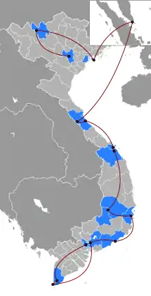 11. ^ Linh Chi & Nhan Phúc Vinh initially arrived at the Finish Line 1st, but were issued three ten-minute penalties totalling 30 minutes (one was for using notes during the calligraphy challenge, and two for not abandoning the taxi after the taxi driver incurred a traffic infraction on both times, both of which was prohibited by the rules[6] (one for driving the wrong way down a one-way street and another through a red light)). Diệp Lâm Anh & Thu Hiền checked in during their penalty time first and won, dropping Linh Chi & Nhan Phúc Vinh to 2nd.