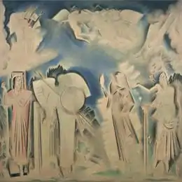The painting shows a secular subject in a religious composition, with a cubist style.[2]