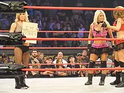 Also in December it was announced on TNA's website that the company had extended an invitation to United States Vice-Presidential candidate Sarah Palin which The Beautiful People looked forward to as they considered her husband to be attractive.[29] A Governor Palin parody character, often referred to simply as The Governor, appeared on December 4 played by Shannon Spruill.[27] Love and Sky were oblivious to The Governor being an imposter, resulting in some comedy skits where Kip tried to convince them they were being fooled while others mocked their stupidity. The Governor, meanwhile, convinced the duo that they would have a makeover that would make them worthy of her cabinet; the makeover involved frumpy clothes, no make-up and unstyled hair. On January 15, Taylor Wilde and Roxxi revealed that it had all been a ruse to humiliate The Beautiful People who, in Wilde's opinion, were making a mockery of TNA's women's division. After this they had mud dropped on them from the ceiling.[30] The following week, The Beautiful People brutally attacked Spruill backstage until Kip stopped them after a sufficient beating.[31] On February 5, The Beautiful People exacted revenge on Roxxi and Wilde in a tag match and put paper bags over their heads; however, their revenge was cut short when The Governor made the save.[32]
