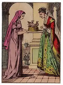 In a Greek tale, The Merchant's Daughter, Daphne, the youngest of the titular merchant's daughters, asks for her father to bring her "The Golden Ring". The Golden Ring is a prince from a foreign country (India) who, after meeting the merchant, tells him he saw Daphne in his dreams and wishes to marry her. The merchant gives his daughter a letter, a cup and the golden ring. The prince metamorphoses into a pigeon to meet Daphne by her window in secret, flies in and jumps into a cup to become human. Some time later, jealous of her hidden happiness, her sisters see that a knife is inside the cup and summon the prince to be hurt while in bird form. It happens thus, and Prince Fortunate (the prince's name) flies back to his kingdom. Learning of her beloved's injuries, Daphne dons a masculine disguise, sails to India and wanders to her prince's kingdom. On the way, she overhears the conversation between two birds about a way to cure the prince: one would have to kill the birds and dip their bodies in a spring to make an ointment that can heal the prince. Daphne kills the birds, prepares the ointment and goes to Prince Fortunate's castle in a doctor's disguise to apply the cure on his body.[15]