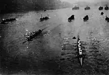 The start of this year's race was moved to the University of London Boat Club, approximately 400 yards (370 m) further upstream. After discussion between the umpire, the two boat club presidents, the coaches Haig-Thomas and Gibbon, and a representative of the Port of London Authority, the course was shortened to avoid potential eddies around temporary buttresses erected by Putney Bridge which was undergoing repair.[9] As noted by former Oxford rower E. P. Evans, writing in The Manchester Guardian, "no comparisons of times with previous races can be made, because the points on the course will be different".[10] It was the first time since the 1863 race that the event was not conducted between the University Stone and Mortlake.[11]