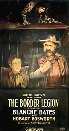 The Border Legion is a 1918 American silent Western film directed by T. Hayes Hunter and starring Blanche Bates, Hobart Bosworth, and Eugene Strong. The film is based on the 1916 novel The Border Legion by Zane Grey.[1] The film marked the screen debut of Blanche Bates.[1] The Border Legion was released on August 28, 1918.[1] Following the acquisition of distribution rights by Goldwyn Pictures, the film was rereleased in the United States on January 19, 1919.[1][2] It is not known whether the film currently survives.[3]