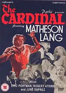The Cardinal is a 1936 British historical drama film directed by Sinclair Hill and starring Matheson Lang, Eric Portman and June Duprez.[1] The film depicts a power battle in sixteenth-century Rome between the leading church-statesman Giuliano de' Medici and one of his rivals. Other themes in the film are the Italian Wars against France and the construction of the new St. Peter's Basilica to a design by Michelangelo.