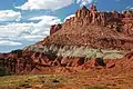 The uppermost portion of The Castle is composed of hard, jointed Wingate Sandstone, which is great for rock climbing, and is believed to have formed about 200 million years ago. This overlays the exposed gray-green layer of the Chinle Formation which was laid down as volcanic ash about 225 million years ago, and beneath Chinle is the Moenkopi Formation (about 245 million years old), all of which date to the Triassic.[3] Long after the sedimentary rocks were deposited, the Colorado Plateau was uplifted relatively evenly, keeping the layers roughly horizontal, but Capitol Reef is an exception because of the Waterpocket Fold, a classic monocline, which formed between 50 and 70 million years ago during the Laramide Orogeny.[4]
