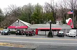 The Coffee Pot was built in 1936 on what later became U.S. Route 221 (Brambleton Avenue) in Roanoke County, before being annexed into Roanoke City in 1943.[4] It was originally constructed by Clifton and Irene Kefauver as a filling station and tea room, but converted into a roadhouse shortly thereafter. The structure itself is similar to that of a log home featuring vertical log architecture on its four facades.[5] At the time of its construction, it was the first commercial structure one would pass along the highway entering Roanoke from the south.[1] The 15-foot (4.6 m) coffee pot is located on the southern end of the structure and is red with a white spout and top. Steam would formerly rise from the coffee pot spout from a furnace located in the store room below, visually bringing life to the coffee pot structure.[1]
