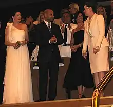 Dolce & Gabbana and Calvin Klein helped Field as well, with some contributions from Lebanese designer Georges Chakra.[54] Although Field avoids making Streep look like Wintour, she dresses her in generous helpings of Prada (By Field's own estimate, 40 percent of the shoes on Streep's feet are Prada). "I know her character was originally based on Anna Wintour," Field said, "but I didn't want to copy someone's style."[55] But, like Wintour and her Vogue predecessor Diana Vreeland, the two realized that Miranda needed a signature look, which was provided primarily by the white wig and forelock she wore as well as the clothes the two spent much time poring over look-books for.[7] "[I]n choosing her wardrobe my idea was that she's a chief fashion editor, she has her own style," Field told Women's Wear Daily in 2016. "We're creating an original character."[56]