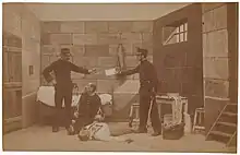 An ironworker with a strong resemblance to Dreyfus was hired for the role in order to increase the series's realism.[14] Méliès himself appears in the series as Dreyfus's attorney Fernand Labori and makes a brief reappearance as a journalist after Labori's attempted assassination.[15] At least one scene, Dreyfus's exit from the courthouse, appears to have been modelled on a news photograph printed in the journal L'Illustration.[16] Méliès drew on both cinematic and theatrical special effects for the series: the lightning in Landing of Dreyfus at Quiberon was added to the scene using multiple exposure, while the rain and rocking motion of the boat were created with stage machinery.[17] The gun smoke in The Attempt Against the Life of Maitre Labori is a puff of poudre de riz, a cosmetic powder.[18]