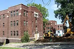 The Elmwood-The Oaks-The Birches, also known as the Grand Trees Apartments, are three historic buildings located in Des Moines, Iowa, United States. The local architectural firm of Vorse, Kraetsch & Kraetsch designed three-story brick structures that were built in 1923.[2] The buildings, which together contain 93 units, are connected by courtyards and stone archways. Above the main entrances are imprints of the trees' leaves - elm, oak, and birch - in the stonework. Parking lots for the apartments are located behind the buildings. A $16.9 million historic renovation was begun in 2021 and will include adding elevators, which the buildings did not have. The buildings were listed on the National Register of Historic Places in 2021.[1]