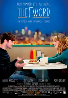 The F Word (released in some countries as What If?) is a 2013 romantic comedy film directed by Michael Dowse from a screenplay by Elan Mastai, based on the play Toothpaste and Cigars by TJ Dawe and Michael Rinaldi.[5] It stars Daniel Radcliffe and Zoe Kazan as two young people who meet and, because she has a boyfriend, decide to be "friends". The supporting cast includes Megan Park, Adam Driver, Mackenzie Davis, and Rafe Spall.