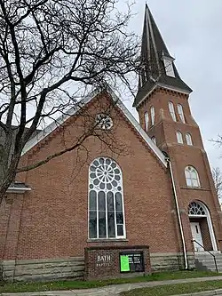 The First Baptist Society of Bath, also known as Bath Baptist Church, is a historic Baptist church located at Bath, Steuben County, New York. The church was built in 1887–1888, and is a cruciform plan, Romanesque Revival style brick and stone church. It has a steep cross-gable roof and square corner bell tower with a tall octagonal spire. The church features rounded windows and lintels. Attached to the church is a fellowship hall built in 1952 and expanded in 1981.[2]:3