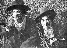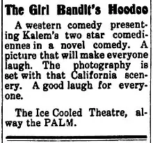 The Girl Bandits' Hoodoo was among the early "photoplays" produced by Kalem at the second studio or "company" it established in California, the one that began operations in Santa Monica in 1911.[4] The other West Coast site, in Glendale, had been set up the previous year.[lower-alpha 5] Each Kalem location was administered as a single, self-contained production company, much like in repertory theatre, with each unit composed of a director, a select group of actors or "principal artists", and a small production crew.[5] The personnel in Santa Monica, as in Glendale, all worked as a team, performing together repeatedly, producing one film project after another.[6] The Girl Bandits' Hoodoo, in keeping with the vast majority of Kalem's releases in the early 1910s, was a one-reeler with a final running length of approximately 1000 feet, and it was filmed in one week or less.[7] Pat C. Hartigan in 1912 was in charge of directing all the productions for the Santa Monica company, which quickly became a unit that specialized in comedies and Westerns. The Girl Bandits' Hoodoo therefore proved to be an ideal blending of both types of motion pictures.[6][lower-alpha 6]