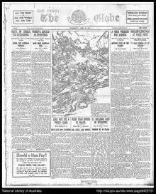 The Globe was first published on 5 April 1911 and continued under this masthead until 17 October 1914, which was its 185th issue. In these years it was published by Alfred Herbert Howard Aldworth for the "Sunday times" Newspaper Co. Ltd.[1] The newspaper then became known, on 24 October 1914, as The Globe and Sunday Times War Pictorial. Hugh Donald McIntosh took over publishing. On 6 November 2016 the title reverted to The Globe until its last issue on 25 June 1917 (issue no. 328).[2] In 1917, The Globe and Sunday Times War Pictorial merged with The Mirror of Australia to form The Mirror whose first publication was 30 June 1917.[3]