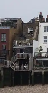 The Grapes is a public house situated directly on the north bank of the Thames in London's Limehouse area, with a veranda overlooking the water. To its landward side, the pub is found at number 76 in Narrow Street, flanked by former warehouses now converted to residential and other uses. It is listed Grade II on the National Heritage List for England.[1]