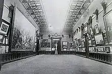 In 1905, Font i Sangrà reclaimed the painting and, due to its dimensions, decided to hang it in a chapel (specially extended for the occasion) on his personal property in Cardadeu, Ca n’Eres Vall. While he kept the bulk of his personal collection at his home (38 Ronda de Sant Pere), The Great Day of Girona became somewhat of a tourist attraction in Cardadeu, as Font i Sagrà took pleasure in showing the work to all who came to see it. After some negotiation, the painting became the property of the City Council of Barcelona as a legacy and was accepted on 18 June 1929. The painting was subsequently added to the collection of the Palace of Fine Arts and put on permanent display in the Hall of Queen Regent.[10] When the MNAC was created in 1934, many of the works from the Palace of Fine Arts were transferred to the National Palace; however, those of larger measurements such as The Great Day of Girona remained in the Palace of Fine Arts.