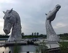 The Kelpies are 30-metre-high (98 ft) horse-head sculptures depicting kelpies, located between Falkirk and Grangemouth, but the Kelpies themselves are situated in Grangemouth,[1] standing next to an extension to the Forth and Clyde Canal, and near the River Carron, in The Helix, a parkland project built to connect sixteen communities in the Falkirk Council Area, Scotland.[2] The sculptures were designed by sculptor Andy Scott and were completed in October 2013.[3] The sculptures form a gateway at the eastern entrance to the Forth and Clyde canal, and the canal extension built as part of The Helix land transformation project. For a short time, they were the tallest equine statues in the world until Pegasus and Dragon was completed the following year.