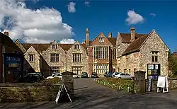 The original house was considerably restructured in the 15th century and replaced with part of the present building. The 15th-century construction can be seen as the central frontage with three gables, and a porch which is thought to date to the 13th century. The building at that time would have had a great hall open to the roof, a parlour with a chamber above, service rooms and a kitchen. The original facing was decorated with flint rubble and herringbone tile courses. The original windows were of Ham Hill stone and traces of these are visible on the frontage. The porch vaulting is also of Ham Hill stone, which is rare in buildings in Salisbury but common in Sherborne which implies that the work was carried out in the Sherborne Abbey's tenancy. The oak entrance door inside the porch, with small wicket leaf and strap hinges, is thought to be original.[2] Later extensions have been added to the north and south. There are smoke louvre trusses in the roof and original fireplaces in several rooms.[4]