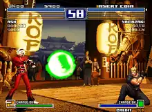 The game was first revealed in Tokyo Game Show 2003, originally planned to be developed on the Atomiswave hardware before settling on the Neo-Geo MVS hardware.[2] In North America the game was released alongside The King of Fighters 2002 for the PlayStation 2 and Xbox.[3] The game was solely released for Switch on February 21, 2019.[4] As the first chapter of a new story arc, Ash was designed as an "attractive evil character", in contrast to previous King of Fighters heroes.[5] Due to Ash's late appearance in The King of Fighters 2003, the staff joked that teammate Shen Woo seemed more like the series' main character than Ash did.[6] The two boss characters, Adelheid and Mukai, had no problems during their designs with the former being the last added to expand the narrative of the series.[7][8] While Kusanagi was first introduced in The King of Fighters 2002 without a plot focused around him, KOF 2003 gave him the idea of being a clone of Kyo Kusanagi created by Chizuru Kagura while also intending to include his school uniform highly popular within Kyo's fans.[9]
