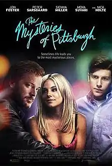 The Mysteries of Pittsburgh is a 2008 comedy-drama film based on Michael Chabon's 1988 novel of the same name. The film was written and directed by Rawson Marshall Thurber. It was produced by Michael London and executive produced by Omar Amanat. Shooting in Pittsburgh ended in October 2006,[2] with the film set for release in 2008. It made its world premiere in January 2008 at the Sundance Film Festival.[3] Set in 1980s Pittsburgh, the film follows the affairs of two young men with one woman, and later also with each other.