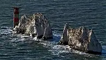 The Needles are a row of three stacks of chalk that rise about 30 metres (98 ft) out of the sea off the western extremity of the Isle of Wight in the English Channel, United Kingdom, close to Alum Bay and Scratchell's Bay, and part of Totland, the westernmost civil parish of the Isle of Wight. The Needles Lighthouse stands at the outer, western end of the formation. Built in 1859, it has been automated since 1994.[1] The waters and adjoining seabed form part of the Needles Marine Conservation Zone and the Needles along with the shore and heath above are part of the Headon Warren and West High Down Site of Special Scientific Interest.[2][3]