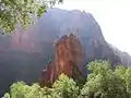 The Pulpit is a 4,600-foot (1,400 m) elevation Navajo Sandstone pillar located in Zion National Park, in Washington County of southwest Utah, United States.[2] The Pulpit is situated in the Temple of Sinawava at the north end of Zion Canyon, rising 160 feet (49 meters) above the canyon floor and the North Fork of the Virgin River which drains precipitation runoff from this rock. It is a photographic icon seen from the parking area at the end of Zion Canyon Scenic Drive, and the entrance to The Narrows. Neighbors include Mountain of Mystery to the north, Observation Point to the southeast, Angels Landing and The Organ to the south, and Cathedral Mountain to the southwest. The first ascent was made April 15, 1967, by Fred Beckey, Eric Bjornstad, Hal Woodworth, Pat Callis, and Galen Rowell.[3]
