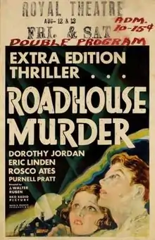 The Roadhouse Murder is a 1932 American pre-Code thriller directed by J. Walter Ruben and written by J. Walter Ruben and Gene Fowler and starring Dorothy Jordan, Eric Linden, Purnell Pratt, Roscoe Ates and David Landau. It was released on April 28, 1932, by RKO Pictures.[1][2][3]