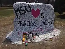 On Wednesday, April 9, 2014, at 9:00 pm, hundreds gathered at the rock to hold a vigil for Lacey Holsworth, dubbed "Princess Lacey", a young 8-year-old girl with terminal cancer who befriended the MSU Basketball team. A movement, highlighted by an article in the Detroit News, sought to ban all future painting of the rock and to preserve it as a permanent memorial to Lacey.[4] By April 21, 2014, four days after her memorial, it was repainted with the message "Congratulations graduates, be a hero to someone".[5]