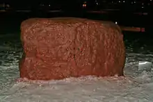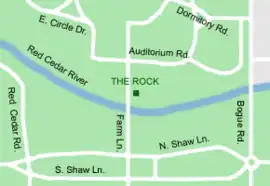 The Rock was unearthed in 1873 near what is now the corner of Grand River Avenue (M-43) and Michigan Avenue in East Lansing, Michigan. It was donated to the (Michigan) State Agricultural College by the class of 1873.[1] The college placed the rock in the "Sacred Space" near the modern day Beaumont Tower, where the stone became a common hangout for young couples and became known as the "Engagement Rock".[2] By the late 20th century, the rock had become better known for protest slogans than engagement photos. In 1985, it was moved to its current location, east of Farm Lane, on the north bank of the Red Cedar River. Today, the innumerable layers of paint obliterate the original inscription: "Class '73".[3]