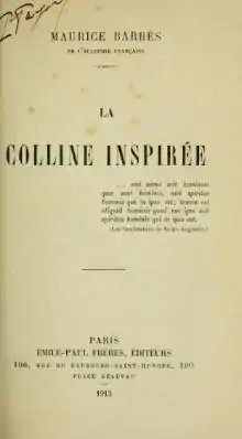 The Sacred Hill (French: La colline inspirée) is a 1913 novel by the French writer Maurice Barrès. It tells the story of three monks who turn the hill colline de Saxon-Sion in Lorraine into a place of worship, which then develops into a cult inspired by the heretic Eugène Vintras. It was translated into English with a foreword by Malcolm Cowley in 1929.