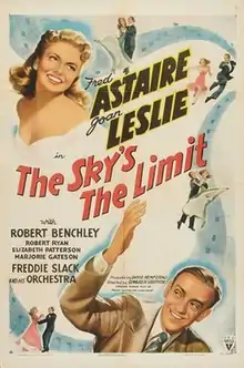 The Sky's The Limit is a 1943 romantic musical comedy film starring Fred Astaire and Joan Leslie, with music by Harold Arlen and lyrics by Johnny Mercer. The film was directed by Edward H. Griffith, and released by RKO Radio Pictures. Astaire plays a Flying Tiger pilot on leave. Robert T. Smith, a real former Flying Tiger pilot on leave before joining the Army Air Forces, was the technical adviser on the film. The comedy is provided by Robert Benchley — his second appearance in an Astaire picture — and Eric Blore, a stalwart from the early Astaire-Rogers pictures.