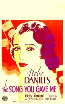 The Song You Gave Me is a 1933 British musical film directed by Paul L. Stein, and starring Bebe Daniels, Victor Varconi, and Frederick Lloyd. It was made at Elstree Studios.[1] The film's sets were designed by the art director John Mead. It was distributed in America by Columbia Pictures. It was based on a play by Walter Reisch which had previously been adapted into the 1930 German film The Song Is Ended.