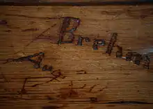 On the second day of battle the Stone House continued to serve as a hospital. Some Union troops also buried their men in the yard of the Stone House. Two members of the 5th New York Volunteer Infantry, Privates Charles E. Brehm, age 21, and Eugene P. Geer, age 17, arrived at the Stone House after being wounded late in the battle, and were taken to an upstairs room.[8] At some point during their stay, both men carved their names into the floorboards of the room they were in. Brehm's carving appears as "Brehm Aug 30", and Geer, unable to complete his last name, left the carving "E.P. Ge." Brehm survived the war and lived until 1909; Geer did not live to see the end of 1862. The carvings can still be seen to this day[5]