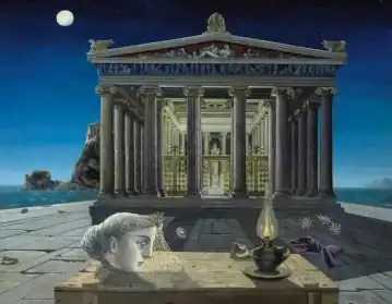 The Temple (French: Le Temple) is a painting made in 1949 by the Belgian artist Paul Delvaux. It depicts a classical temple building in moonlight, with the head of a statue and several modern objects in the foreground. The painting was made in Choisel outside Paris where Delvaux lived temporarily with his lover and future wife Anne-Marie "Tam" de Maertelaere. It is an oil painting with the dimensions 113.7 cm × 146 cm (44.8 in × 57.5 in).