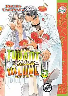 The Tyrant Falls in Love (Japanese: 恋する暴君, Hepburn: Koisuru Bōkun) is a Japanese yaoi manga series written and illustrated by Hinako Takanaga. The Tyrant Falls in Love is a sequel to Takanaga's series Challengers.[1] The series has appeared on manga best-seller lists both in Japan and in Germany,[2] and the long-delayed US release has been labeled "one of the most highly-anticipated yaoi releases ever".[3] The series is licensed in English by Juné. It is also licensed in German by Tokyopop Germany with the title Verliebter Tyrann, in Polish by Kotori with the title Zakochany tyran, and in French by Taifu Comics with the title The Tyrant Who Fall in Love.[4][5][6]