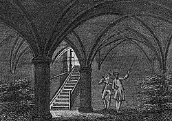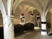 Generally, a medieval undercroft was built with at least three vaulted bays depending on the wealth or storage needs of the owner. Built of stone and therefore fireproof,[2] an undercroft would have been used for storing foodstuffs or liquids such as barrels of wine or items of value. When built under a house an undercroft and, more importantly its contents, could be watched at all times. While undercrofts are on occasion called 'cellars' they were not exclusively built completely below ground level; the fact of being built into the ground often resulted in their being preserved when the building above was no longer used or when another building was erected in its place. There are the remains of about another half a dozen medieval undercrofts in Guildford. Being constructed of masonry they were costly to build and only could have been afforded by rich merchants which reveals that Guildford was a wealthy town during the Middle Ages.[1][3]